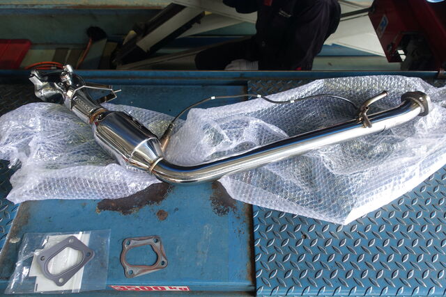 令和7年式 スズキ ジムニー (JB64) トラストのスポーツキャタライザー交換で ご入庫いただきました。 この商品はガスレポート付きとのことで、そのまま車検を通せるものか?小牧検査事務所に確認してみました。 詳細は割愛させていただきますが、大丈夫そう と判断し、受注。メーカーさんの標準取付時間は3.5時間となっておりましたので、これは7時間ぐらいかかるかな ということでスタート。