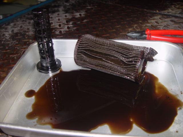 エンジンオイルが少ない状態(レベルゲージのローラインより随分下)でしたので、フィルターとともに交換することに。 そしてフィルターを外すと、あれ、いつもと違うところから外れて??