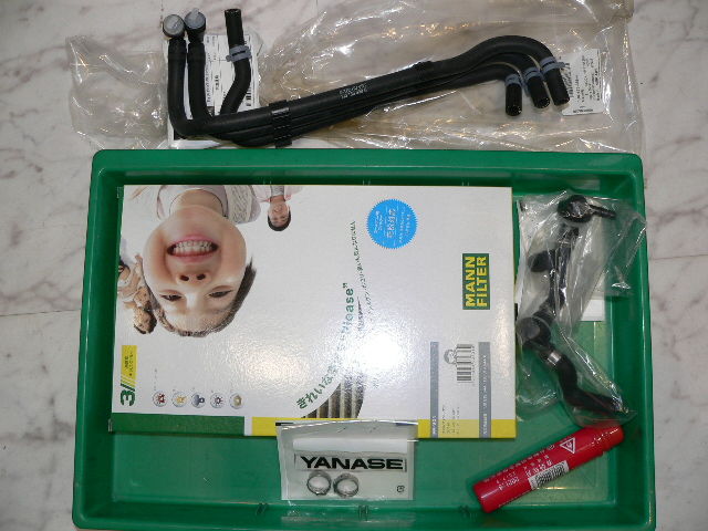 写真2枚目は、外したパーツ。 ポーレンフィルターには枯葉やゴミが沢山取れています。 フューエルホースには かなりのひび割れが見られます。