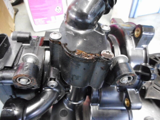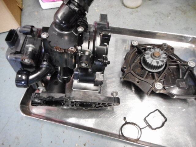 写真2枚目 やっと外れたウォーターポンプとサーモスタットハウジング(以下サーモ)。