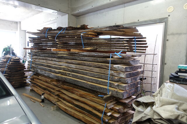 1週間前に製材して自宅ガレージに置いた1枚板ですが、今日は一番下側の桟木が2本でしたので、上側と合わせるため3本に変更。この作業で3.6メーターの2本分を1.5tフォークリフトで上がるのか、挑戦してみるも、結果はダメ。 ということで、順番に降ろしていき、一番下を3本に変更。 そして元通り もう1セット積み上げて元に戻すのですが、その前に 今日はさらに もう1セット(桜4メーター)を積み上げた状態で3段積みにしました。 ガレージの天井(3.05M)近くまで積み上がり、スペースが広くなりました〜。