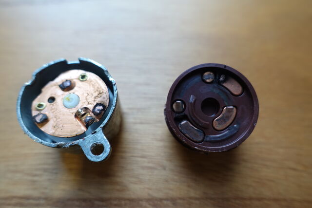 外したパーツを分解してみると 写真のとおり、端子が焦げているところ(右側の1時の位置)あり。