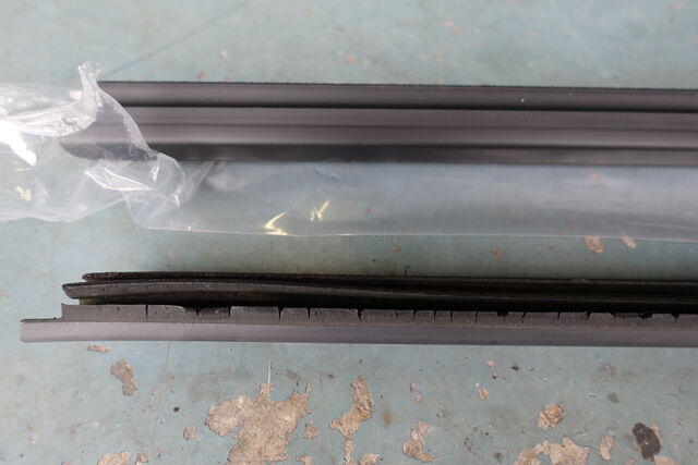 当店の働く車、平成19年式スズキ エブリィ4WD 右後ドアウエザーストリップアウターですが、ゴムがひびひびに割れておりました。 走行するには問題ないですが、見た目がよろしくないのでパーツを取り寄せました。 このパーツ、軽自動車用にしては案外高価で5995円。 同じパーツの右前もゴムの劣化が見られますが、今回はパス。写真1枚目、2枚目 上側が新品、下側が外したもの。