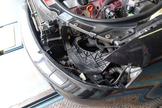 これで、本題のエアコンチェック開始。 吹き出し口温度は外気温と同じですから、全く効いていない。 目視でガス漏れ箇所がないか、上からと下から両方で探していくと 左ヘッドライトの隙間から、下側にあるエアコンガスのプレッシャスイッチ部にオイル跡を発見。