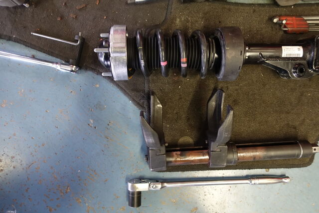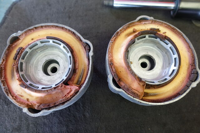 写真4枚目 外したアッパーマウントとスプリングディスクパッド、そしてこの下側にスプリングシムアッパー。 この作業は、見かけよりも時間がかかります。 数年前にVWトゥアレグで同じような作業経験がありますが、それでも大変ですね。