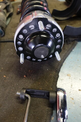 写真3枚目 アッパマウント中央のダンパートップナットを締めるには、こんな工具が必要です。ロッドが回らないように6角レンチの6ミリで固定しておいて、18ミリナットを締めこんでいきます。