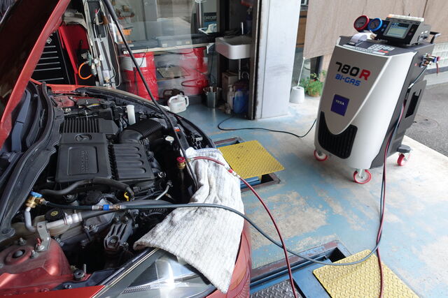 当店代車のマツダ デミオ エアコンリフレッシュをしてみました。昨年8月にも 同作業をしておりましたが、ガス量は172gも減っておりました。