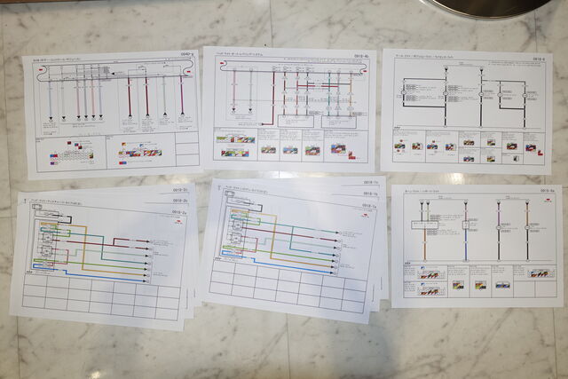 写真1枚目 12枚の配線図をプリントアウトして、ハロゲン車とHID車の違いをピックアップ。