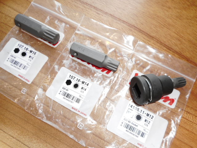 右から1/2のトリプルスクエアM12、トリプルスクエアM16ビット(1インチのソケットに入れる)、トリプルスクエアM14ビット(1インチのソケットに入れる)です。