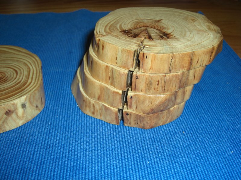 4月頃から、暇な時間を利用して 木工作業をしていますが、コースターの完成発表していませんでした(笑)写真の1組です。 第一弾の材料は、スギ。 1本の枝から切り出していますので、綺麗に重ねてテーブルに置くとなかなか良いです(自己満足)