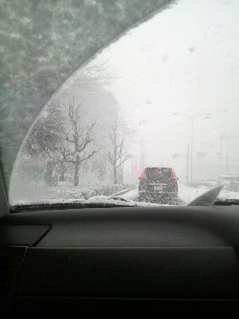 写真1枚目渋滞中に次男が携帯で撮影。 あっという間に雪が積もりましたよ。