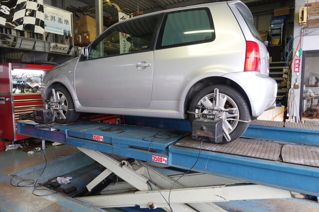 写真3枚目 ドライブシャフトを脱着するため、サスペンション系を分解しましたので、4ホイールアライメント測定、調整をします。