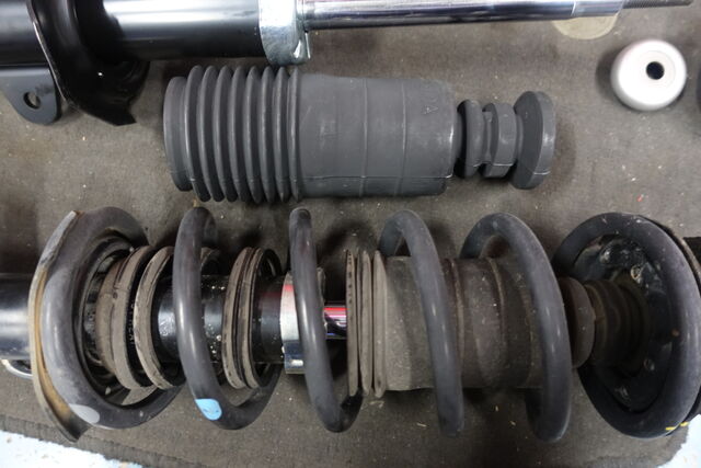 写真1枚目 フロント一式。 この写真を撮影するためパーツを並べましたが、スプリングとゴムシートがリア用でした。 グリーンのケース内は合わせて用意したBMW純正パーツ。