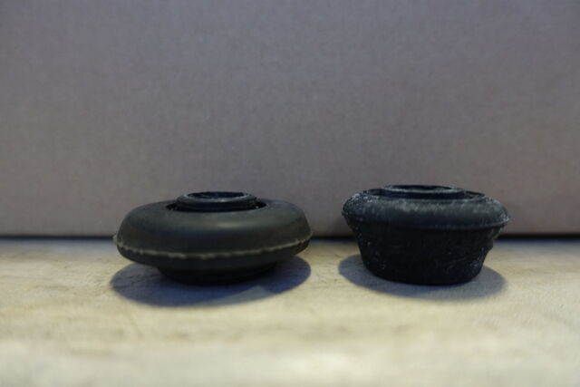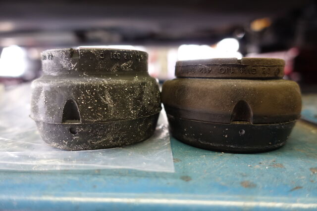 写真4枚目 アッパーマウント新旧。 左が新品、右が外したもの。 外したものは真上から見るとセンターも内側にズレておりました。 このパーツは必ずVW純正品でないとダメです。