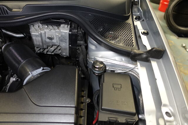 左前は 丁度良い場所に取付スペースがあり、空いたステーまでありますので、ここに リアと同じオリジナルステーを使って固定。(写真2枚目、3枚目) 一方反対の右前はスペースが無くて、キャンセラー付属のスポンジとタイラップにて固定となりました。