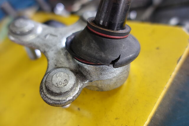 写真2枚目、3枚目 約3年前に交換したロワアームボールジョイント(OEM品)ですが、ブーツがパックリ破れてしまっていましたので、ブーツのみ交換します。 今度は日本製ブーツになりますので、耐久性は飛躍的に上がると思います。