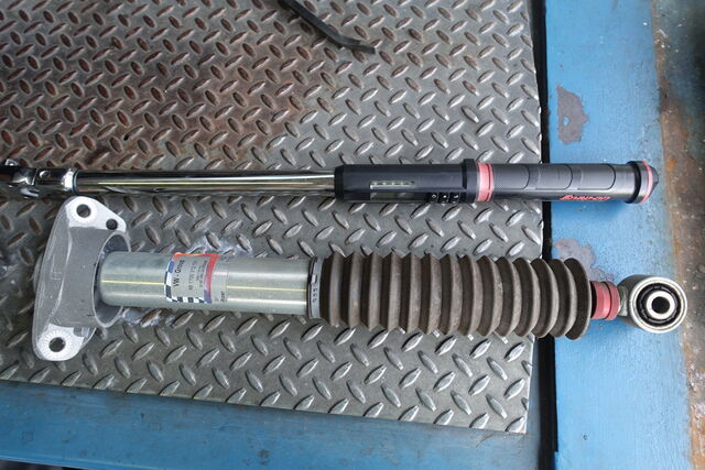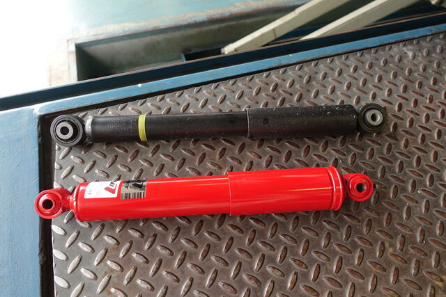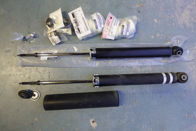 写真1枚目 左リアダンパー。 上側が新品、下側が外したもの。 写真に写っていませんが、この後外した右ダンパーはオイル漏れが始まっておりました。