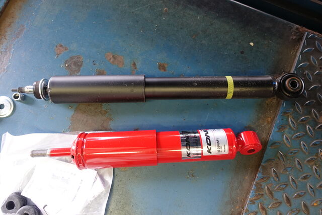 写真1枚目 リアの純正とコニーです。 コニーが かなり太く、オイル容量たっぷりなのが判ります。