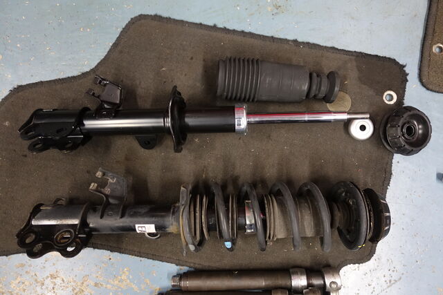 まずは写真1枚目のリアから交換スタート。 アッパーマウント、バンプラバー、ダストブーツ、ダンパー下側ナット等全てVW純正品です。