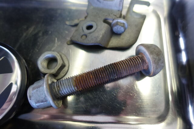 写真1枚目 フロントダンパー下側ボルトですが、予想の通りサビサビでした。 ここも新品パーツが用意してありますから、ばっちりです。