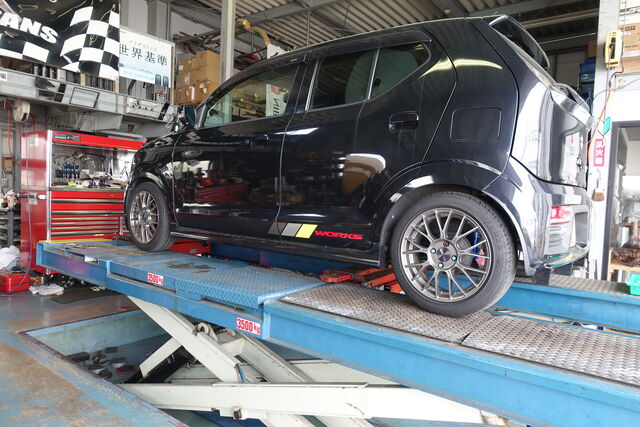 平成28年式(2016年)スズキ アルトワークス2WD 5M/T 「他店にて取り付けた車高調整キットの乗り心地が悪いので何とかならないか」「直巻きスプリングをもっと柔らかいものに替えるとか・・・」とのことで、ご入庫いただきました。付いているキットは全長調整式 クスコのストリートZERO A でした。