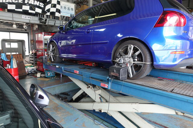 追加で「4ホイールアライメント測定、調整も・・・」となりましたので、作業。作業前の試運転でステアリングセンターが狂っていましたから、調整が必要ですね。