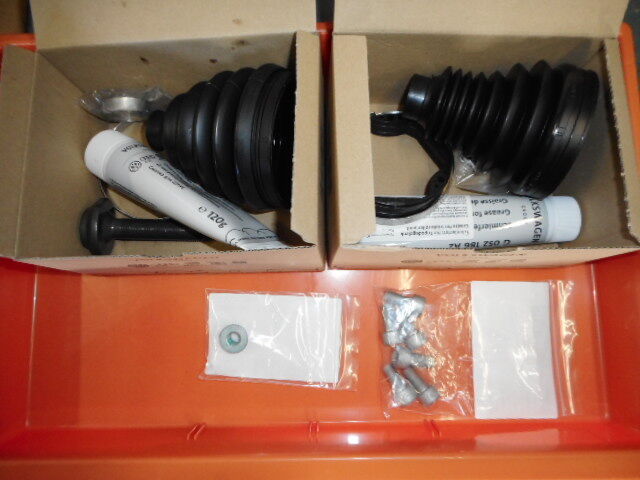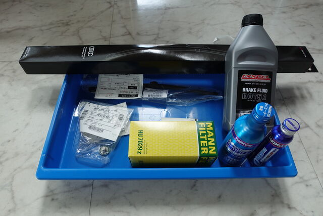 写真1枚目 用意したパーツ。 全てアウディ純正品で、ブーツ外側、内側、インナー取り付けボルト6本、アッパーアームナット1個と再使用不可のボルト、ナットも整備書の指示どおり手配。