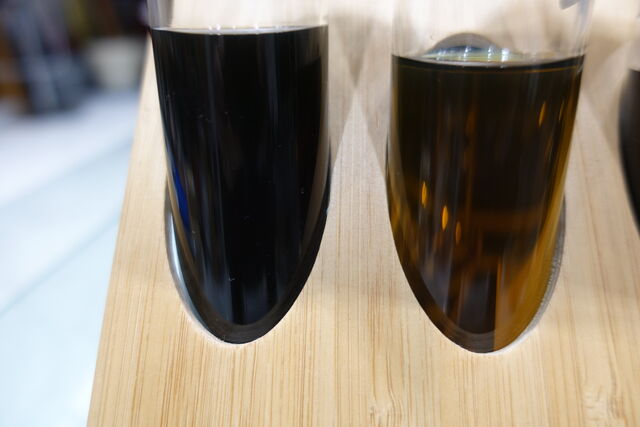 写真2枚目 左側が初めに抜き取ったATF、右が最後の油量調整でオーバーフローしたオイル。2回入れて、抜いてを繰り返しましたので かなり綺麗になりました。